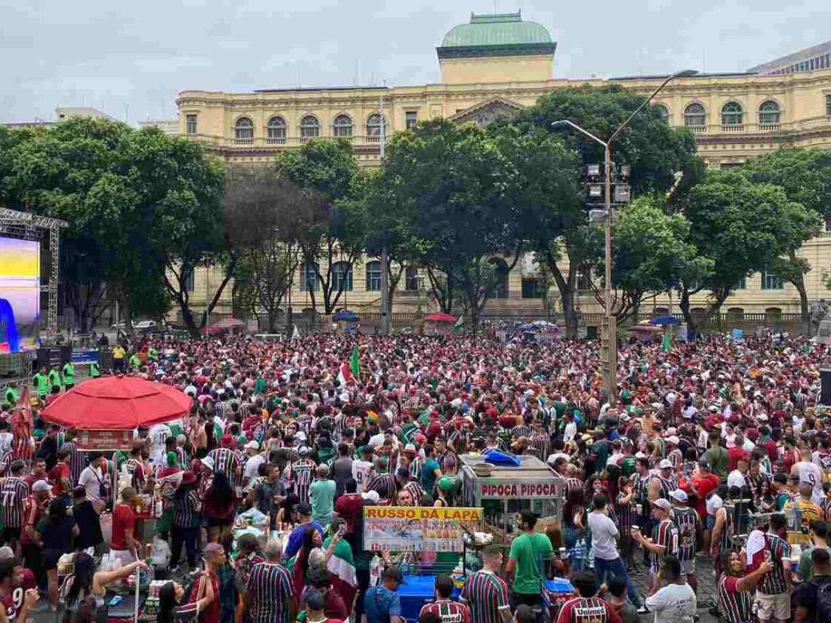 15h10 - O Jogada10 também está na Cinelândia, o QG da torcida do Fluminens e que não conseguiu ingresso. tem telão para o Tricolor não perder nenhum detalhe e, restando quase 2h para o início da final, milhares já estão no local ao som de "Vamos Tricolores".