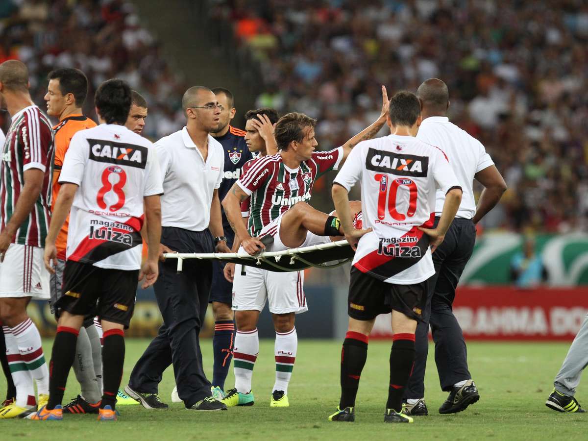 Diguinho recebeu entrada duríssima de Kadu, que foi expulso de campo. O volante do Fluminense deixou o campo na maca