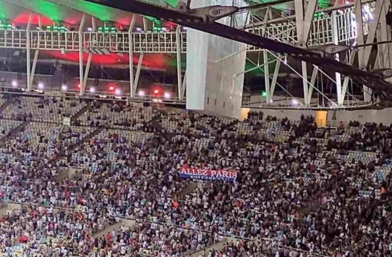 A faixa exibida estava com a frase "Allez Paris". Ou seja, na tradução para o português "Vamos, Paris".