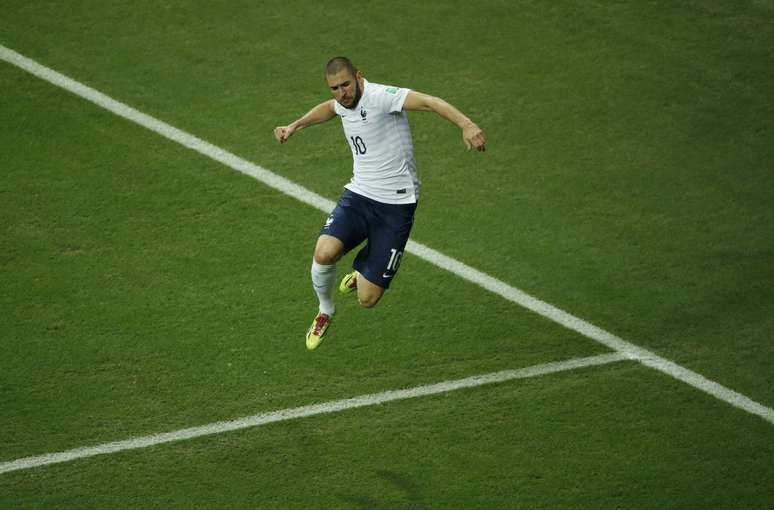 Benzema comemora ao marcar o quarto gol francês em cima da suíça