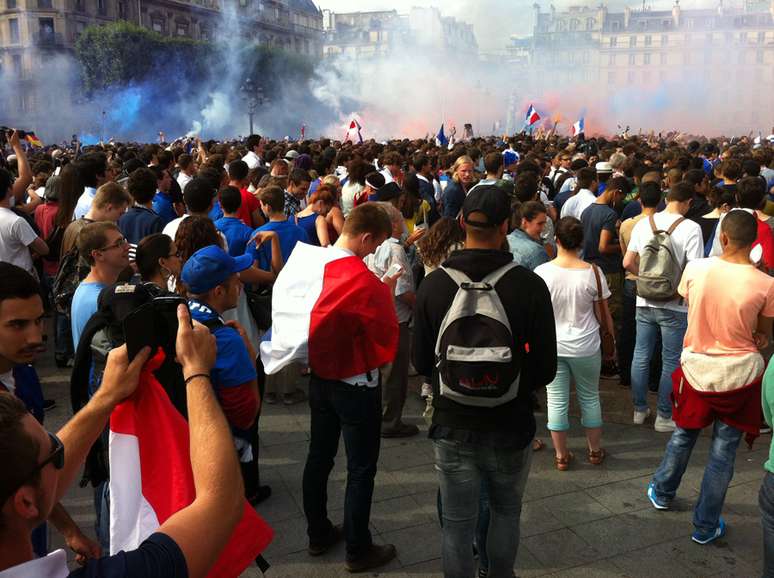 Milhares de torcedores lotaram a praça em frente ao prédio da Prefeitura de Paris. Apesar da empolgação, os franceses viveram o seu Maracanaço ao perderem para os alemães por 1 a 0 e foram eliminados da Copa do Mundo, nesta sexta-feira, no Rio de Janeiro. "Quando eu olho para trás e lembro que nos classificamos na repescagem, eu fico contente", comentou Arthur Pernel (à esq.)