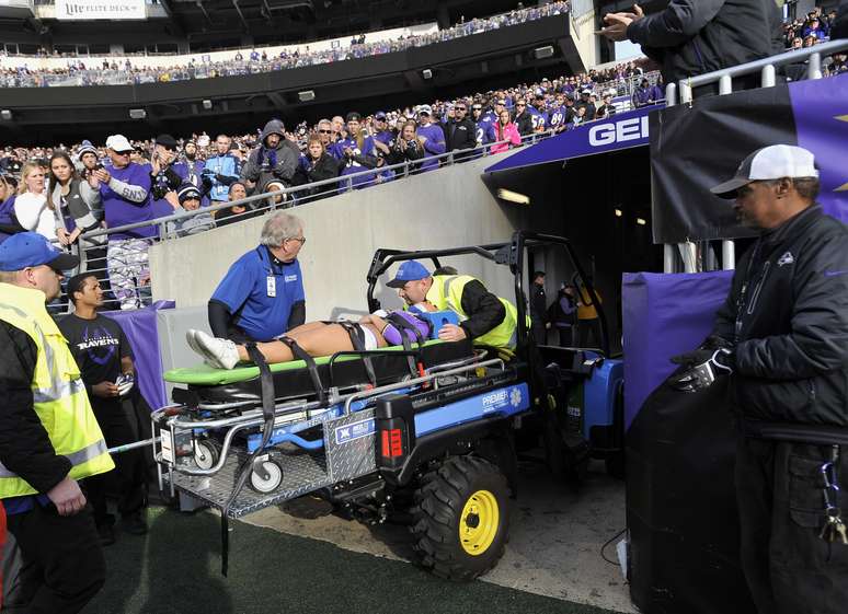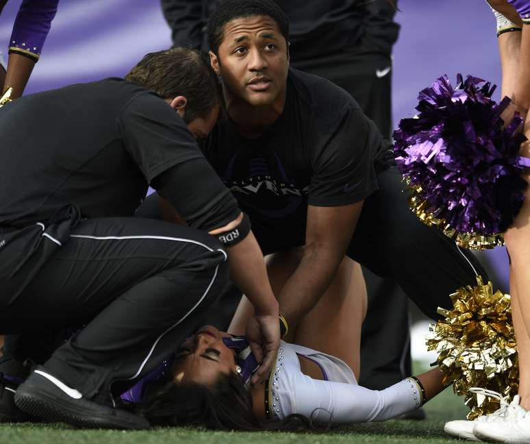 A bela moça não teve a sua identidade divulgada, mas, segundo informações da imprensa americana, sofreu uma queda feia durante uma das inúmeras apresentações das cheerleaders dos Ravens nos intervalos do jogo.