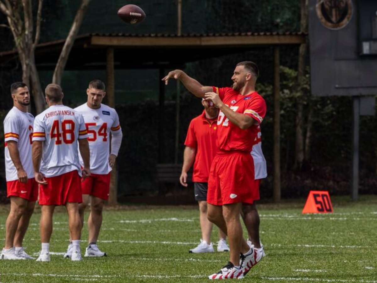 A torcida brasileira, apaixonada por NFL e por futebol americano, recebeu nesta quarta-feira, 3, a delegação do Kansas City Chiefs no Aeroporto de Cumbica, em Guarulhos (SP). Entre os principais nomes da equipe, as maiores celebrações dos aficionados foram com Travis Kelce, noivo de Taylor Swift, e Patrick Mahomes.
