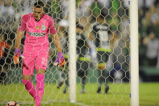 Lateral Reinaldo bate com categoria com a perna esquerda e abre o marcador na final. Bateu no lado esquerdo e deslocou o goleiro Armani. Chapecoense 1 x 0 Atlético Nacional.