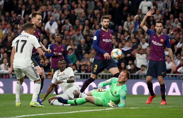 Ter Stegen vê a bola passar após chances de Vinicius Jr e Lucas Vasquez na área. Foto: Reuters