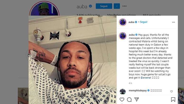 Pierre-Emerick Aubameyang usou as redes sociais nesta quinta-feira para revelar que contraiu malária. O capitão do Arsenal atuou pela seleção do Gabão durante a janela de jogos internacionais no mês passado.