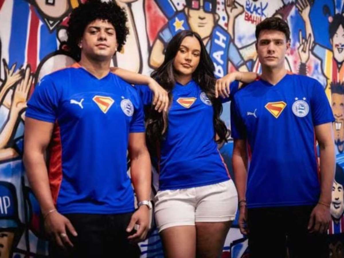 Além disso, na região do peito, entre o escudo do Bahia e o logo da Puma, há o emblema do Superman, que ganha destaque nas cores vermelho e amarelo.