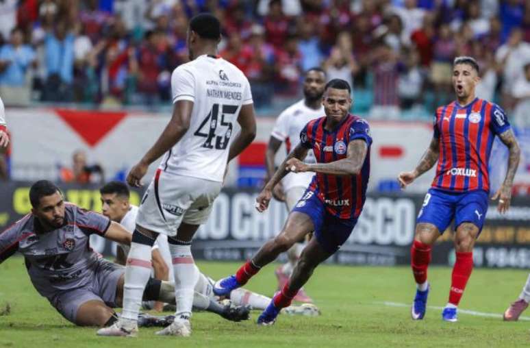 O gol animou ainda mais o time tricolor, que seguiu atacando em busca da virada. Pouco depois, aos 20 minutos, o Bahia voltou a explorar o lado direito do campo e criou outra jogada perigosa. Acevedo apareceu novamente próximo à área e cruzou na diagonal. Então, Jean Lucas surgiu mais uma vez no lance e finalizou para as redes, virando o placar para 2 a 1 e ampliando a pressão sobre o Vitória na etapa final do clássico.