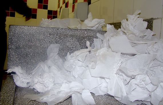 No intervalo, o movimento intensifica, mas não há congestionamento de pessoas devido ao grande número de banheiros. A limpeza, porém, começa a piorar. Uma pilha de papel toalha começa a se formar na bancada das pias. Além disso, o papel higiênico não é reposto (porém, ainda tem em sete dos oito banheiros) e acaba sendo jogado fora do cesto de lixo. As portas seguem com trincos e fechaduras, sem registro de vandalismo que ocasionasse destruição ou prejuízos a estrutura. Já as torneiras e as descargas também têm água. Ainda há sabonete líquido, mas não há papel toalha em um dos três compartimentos, o que deixa o banheiro menos higiênico. Existe papel jogado em um deles e alguns com água suja.