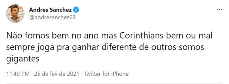 "Não fomos bem no ano, mas o Corinthians, bem ou mal, sempre joga pra ganhar, diferente de outros. Somos gigantes", postou o ex-presidente do Timão no Twitter.