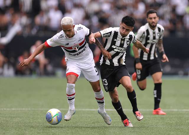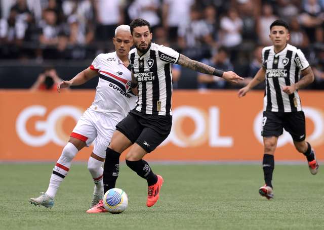 Raul Godoy/Redação Terra: O Botafogo passou pelo primeiro tempo como deve ser para um time que precisa apenas segurar o resultado para ser campeão. Trabalhou bem a bola e soube se defender quando o São Paulo teve a posse. Os melhores momentos vieram justamente após o gol do Fluminense sobre o Palmeiras no Allianz Parque, que foi comemorado como se tivesse acontecido no Nilton Santos. Ainda durante os gritos da torcida, Savarino abriu o placar e aumentou a explosão no estádio. (Foto: REUTERS/Ricardo Moraes)