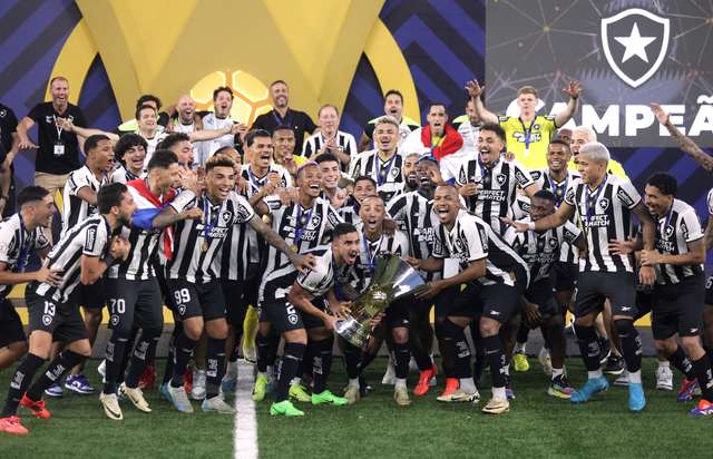 AQUECIMENTO. Jogadores do Botafogo aquecem aos gritos de “é campeão”. Apesar da possibilidade de título neste domingo, cantos consideram o título da Libertadores conquistado no dia 30 de novembro. Aquecimento tem “Sujeito de Sorte”, do Belchior, como trilha sonora, em referência à volta por cima após frustração da equipe na última temporada. (Foto: Raul Godoy/Terra)