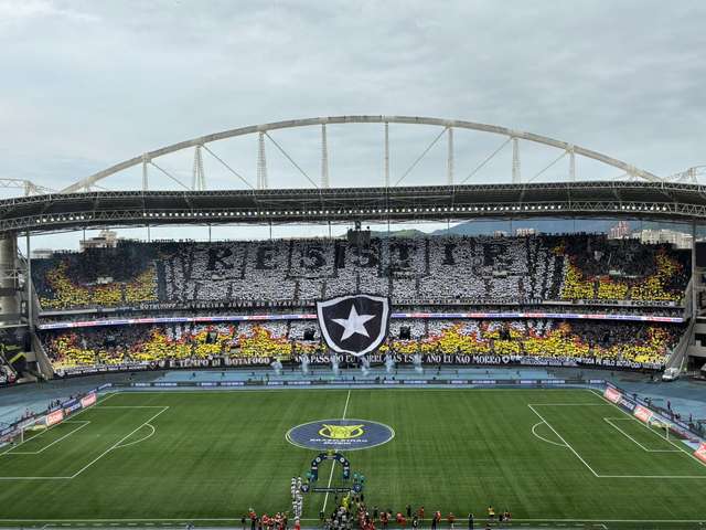 Raul Godoy/Redação Terra: A entrada dos jogadores no gramado foi marcada por mais um mosaico da torcida do Botafogo. Desta vez, os papeis de dupla face mostraram a frase “Resistir” e, na sequência, a imagem do troféu da Libertadores. Mesmo com a boa fase, a torcida alvinegra não esquece dos anos sombrios que assolaram General Severiano.