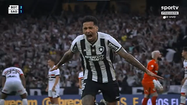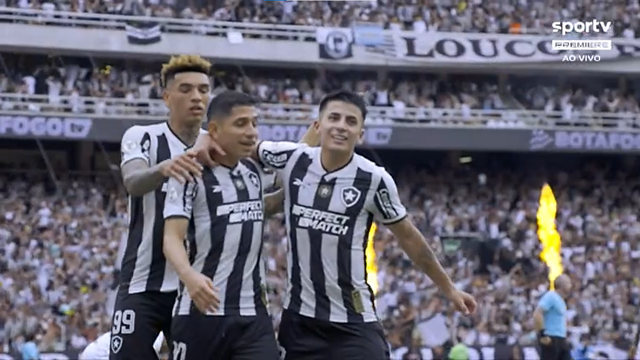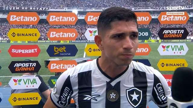 'MANTER O FOCO'. Jefferson Savarino (Botafogo), em entrevista ao SportTV, no intervalo da partida: "Sempre fico feliz por fazer gol com esse clube. Temos que aproveitar o momento que estamos vivendo. Hoje tem sido um desgaste muito forte, tá quente hoje, mas temos que manter o foco e manter o jogo no segundo tempo". Sobre o jogo do Fluminense x Palmeiras, Savarino disse que o foco tem que seguir sendo o Botafogo: "O foco sempre tem sido pensar em nós e no que nos fazemos. Tem que ser assim ate finalizar o jogo". (Foto: Reprodução/SportTV)