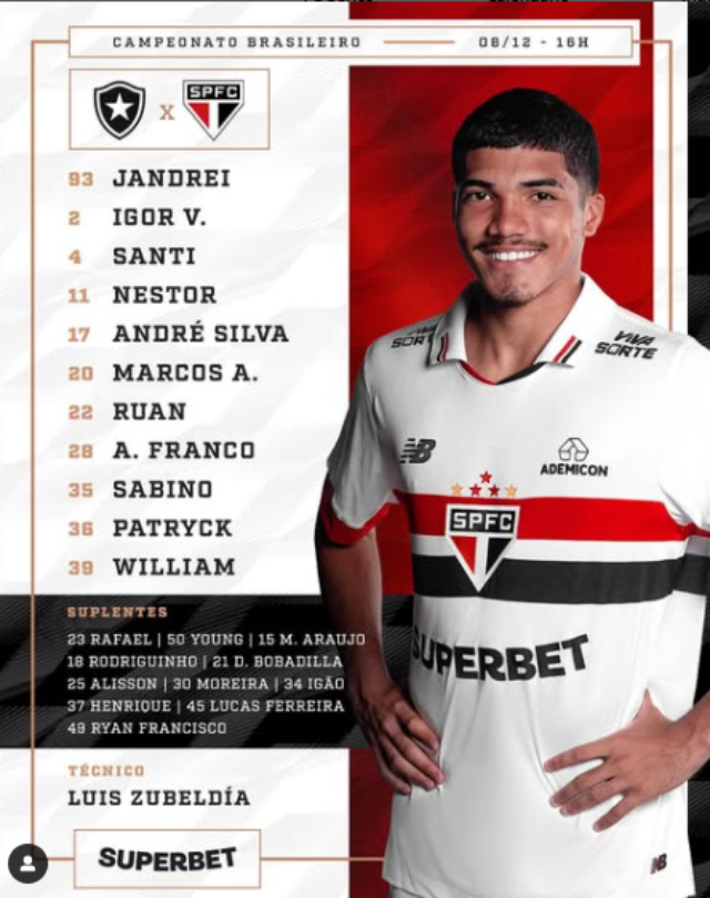 SÃO PAULO DEFINIDO! O técnico Luis Zubeldia mandou um time de reservas para enfrentar o Botafogo no Estádio Nilton Santos. Nomes como Luciano e Lucas sequer viajaram com a delegação tricolor. (Foto: Reprodução/Instagram/@saopaulofc)