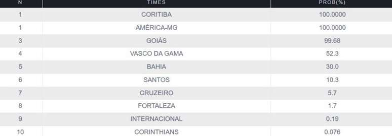 No momento, apenas América-MG e Coritiba já têm seu rebaixamento confirmado, enquanto o Goiás está caminhando para tomar o mesmo rumo, se encontrando com 99,68% de chance em cair para a Série B. Caso esse número se confirme, restará apenas mais uma vaga na zona da degola.