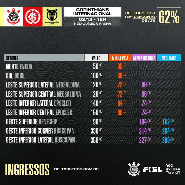O setor mais barato para a compra é o Norte, com preço de R$ 50,00. Em seguida, respectivamente, aparecem Sul (R$ 100,00), Leste (com preços que variam de R$ 120,00 a R$ 150,00) e Oeste (de R$ 190,00 a R$ 350,00). Membros do Fiel Torcedor têm descontos.