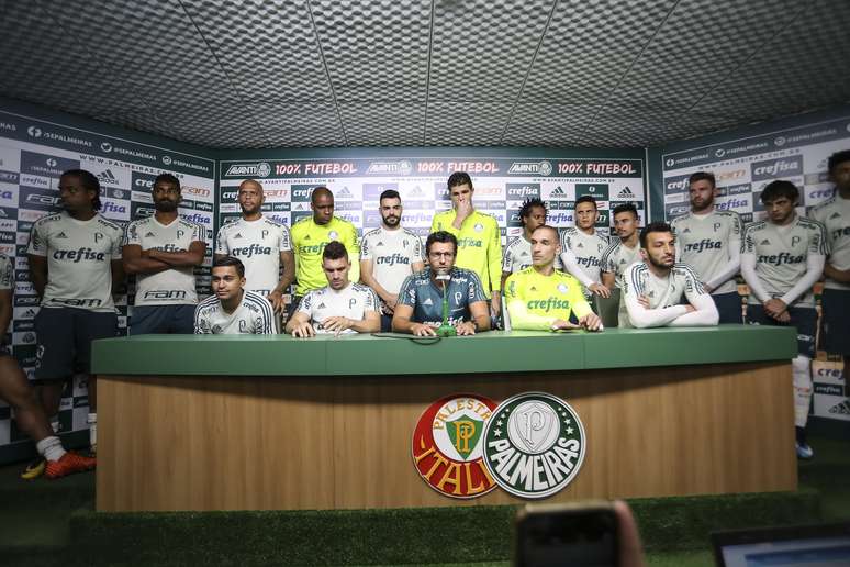 Representantes do grupo, Edu Dracena, Dudu, Moisés e Fernando Prass sentaram-se ao lado de Valentim, enquanto os demais atletas ficaram de pé. De todo o grupo, 27 jogadores estiveram presentes - apenas Egídio, resolvendo problemas particulares, Yerry Mina e Borja, na seleção da Colômbia, não estavam presentes.