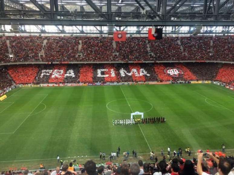 Depois, já dentro do estádio, espetáculo continuou. Durante a execução do hino nacional, os torcedores levantaram os painéis colocados nas cadeiras antes do jogo e formaram um mosaico, o também primeiro no local reformado, com a seguinte descrição: “Pra cima, Atlético-PR (no nome do clube, um bandeirão em formato de bolacha)”. O desenho cobriu toda a reta da Getúlio Vargas Inferior, desde o setor da Buenos Aires até o Coronel Dulcídio.
