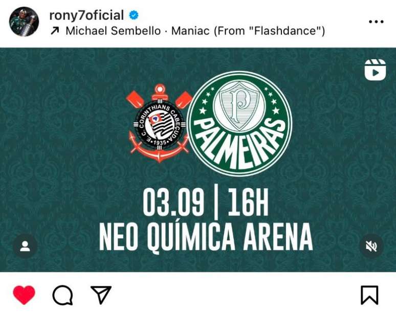 O clima provocativo do Derby começou antes mesmo da bola rolar para Corinthians x Palmeiras, neste domingo (3), na Neo Química Arena, pela 22ª rodada da Série A do Campeonato Brasileiro. Em um post tradicional de cada jogador antes de uma partida, Rony aproveitou um episódio recente para provocar o arquirrival do Verdão.