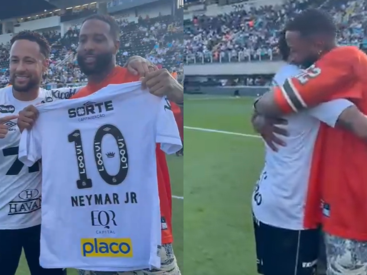 Em vídeo publicado pelo Santos nas redes sociais, Neymar se aproxima e sorri para o jogador do outro esporte, pegando uma camisa nas mãos para então entregá-la para Beckham. Na sequência, os dois se abraçam.