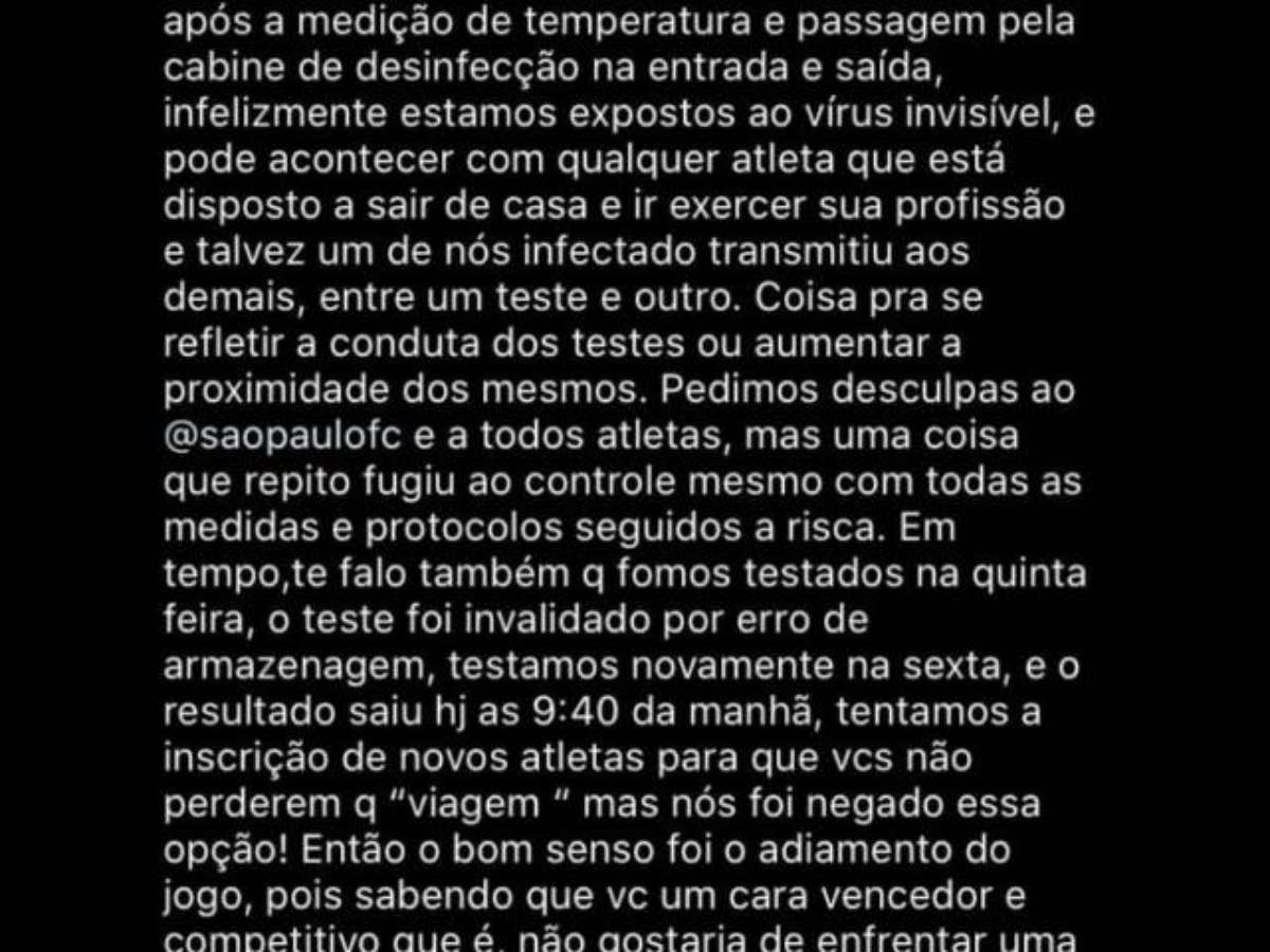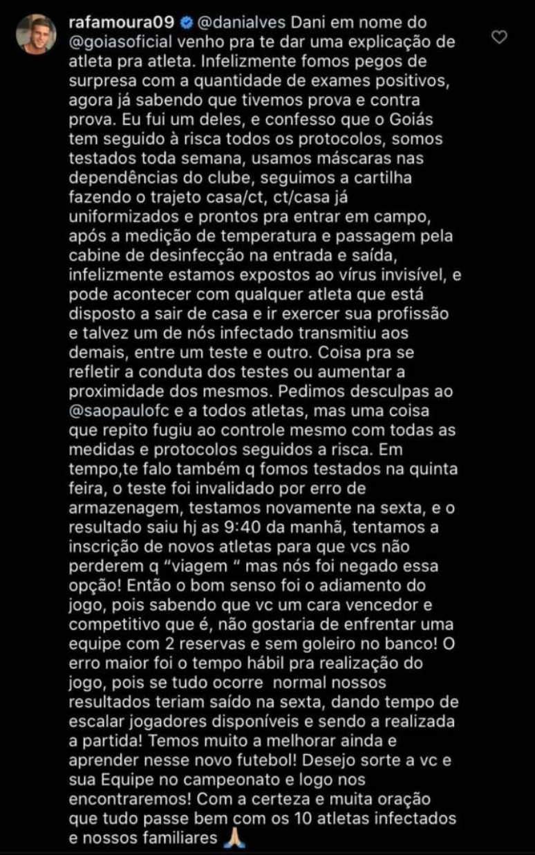 Dani, em nome do Goiás, venho para te dar uma explicação de atleta para atleta. Infelizmente fomos pegos de surpresa com a quantidade de exames positivos, agora já sabendo que tivemos prova e contra prova. Eu fui um deles e confesso que o Goiás tem seguido à risca todos os protocolos, somos testados toda semana, usamos máscaras nas dependências do clube, seguimos a cartilha fazendo o trajeto casa/CT, CT/casa já uniformizados e prontos para entrar em campo, após a medição de temperatura e passagem pela cabine de desinfecção na entrada e saída. Infelizmente estamos expostos ao vírus invisível, e pode acontecer com qualquer atleta que está disposto a sair de casa e ir exercer sua profissão. Talvez um de nós infectados transmitiu aos demais, entre um teste e outro. Coisa para se refletir a conduta dos testes ou aumentar a proximidade dos mesmos. Pedimos desculpas ao São Paulo e a todos os atletas, mas foi uma coisa que fugiu do controle mesmo com todas as medidas e protocolos seguidos à risca. Em tempo, te falo também que fomos testados na quinta-feira, o teste foi invalidado por erro de armazenagem, testamos novamente na sexta e o resultado saiu hoje às 9h40 da manhã. Tentamos a inscrição de novos atletas para vocês não perderem a "viagem", mas nos foi negada essa opção! Então, o bom senso foi o adiamento do jogo, pois sabendo que você é um cara vencedor e competitivo, não gostaria de enfrentar uma equipe com 2 reservas e sem goleiro no banco! O erro maior foi o tempo hábil para a realização do jogo, pois se tudo ocorre normal, nossos resultados teriam saído na sexta, dando tempo de escalar jogadores disponíveis e sendo realizada a partida! Temos mutio a melhorar ainda e aprender nesse novo futebol! Desejo sorte a você e sua equipe no campeonato, logo nos encontraremos! Com certeza e muita oração, tudo vai passar bem com os 10 atletas infectados e nossos familiares.