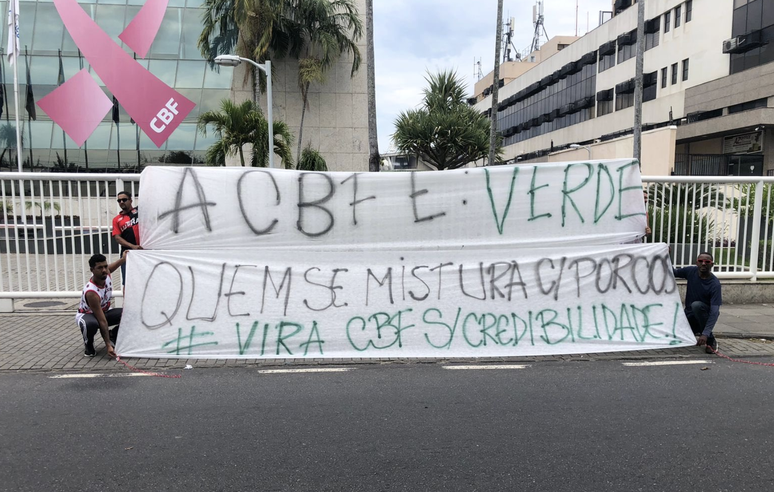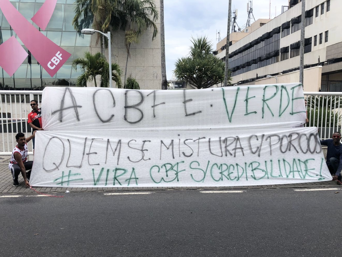 Um grupo pequeno de torcedores do Flamengo levou faixas para protestar em frente a sede da Confederação Brasileira de Futebol (CBF), no Rio de Janeiro, neste sábado, 18, na véspera do duelo contra o Palmeiras pelo Campeonato Brasileiro.
