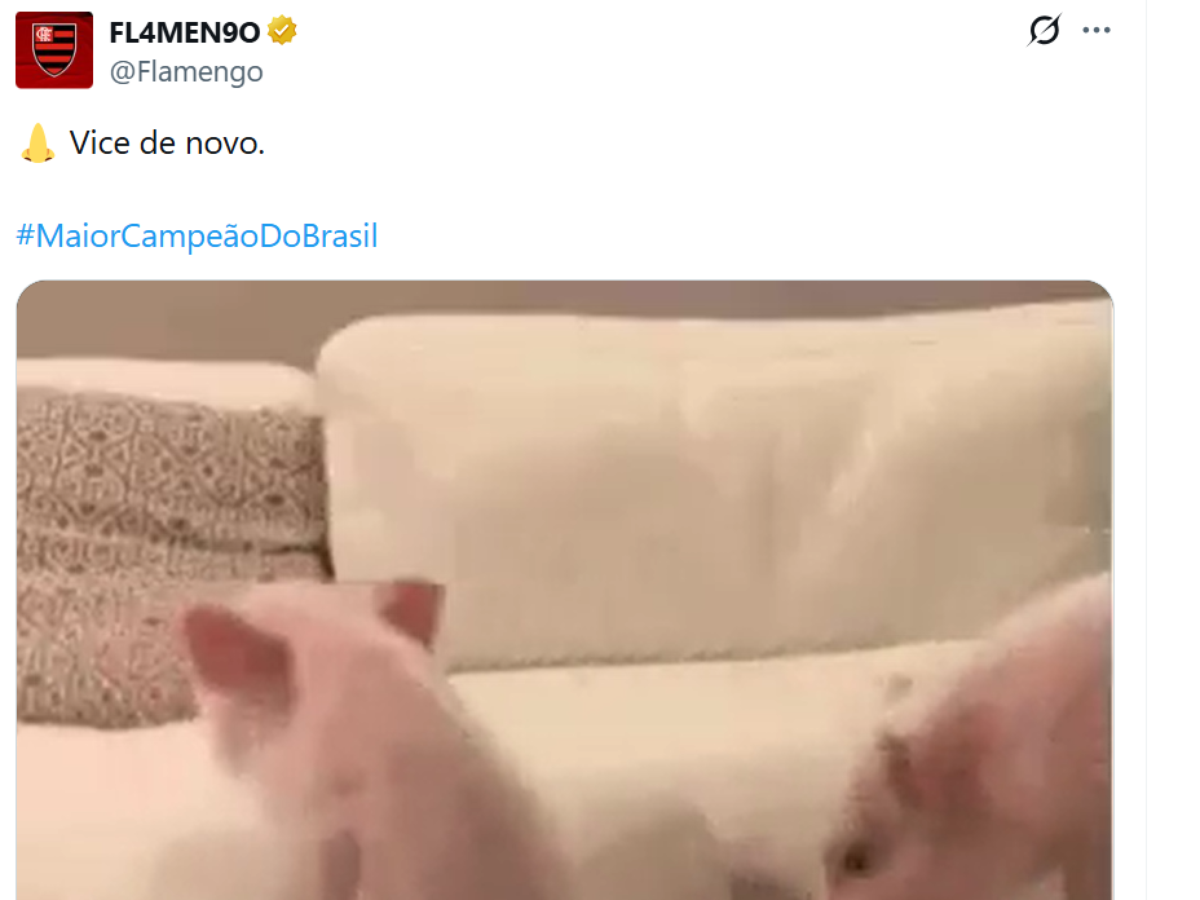 "Vice de novo", escreveu o Rubro-Negro no X, com um emoji de nariz -- indicando que os rivais ficaram apenas com o 'cheirinho' do título' --, e um GIF de porquinhos caindo de um sofá. A postagem compartilhou o resultado da vitória do Verdão por 3 a 0 contra o Atlético-MG (veja abaixo).