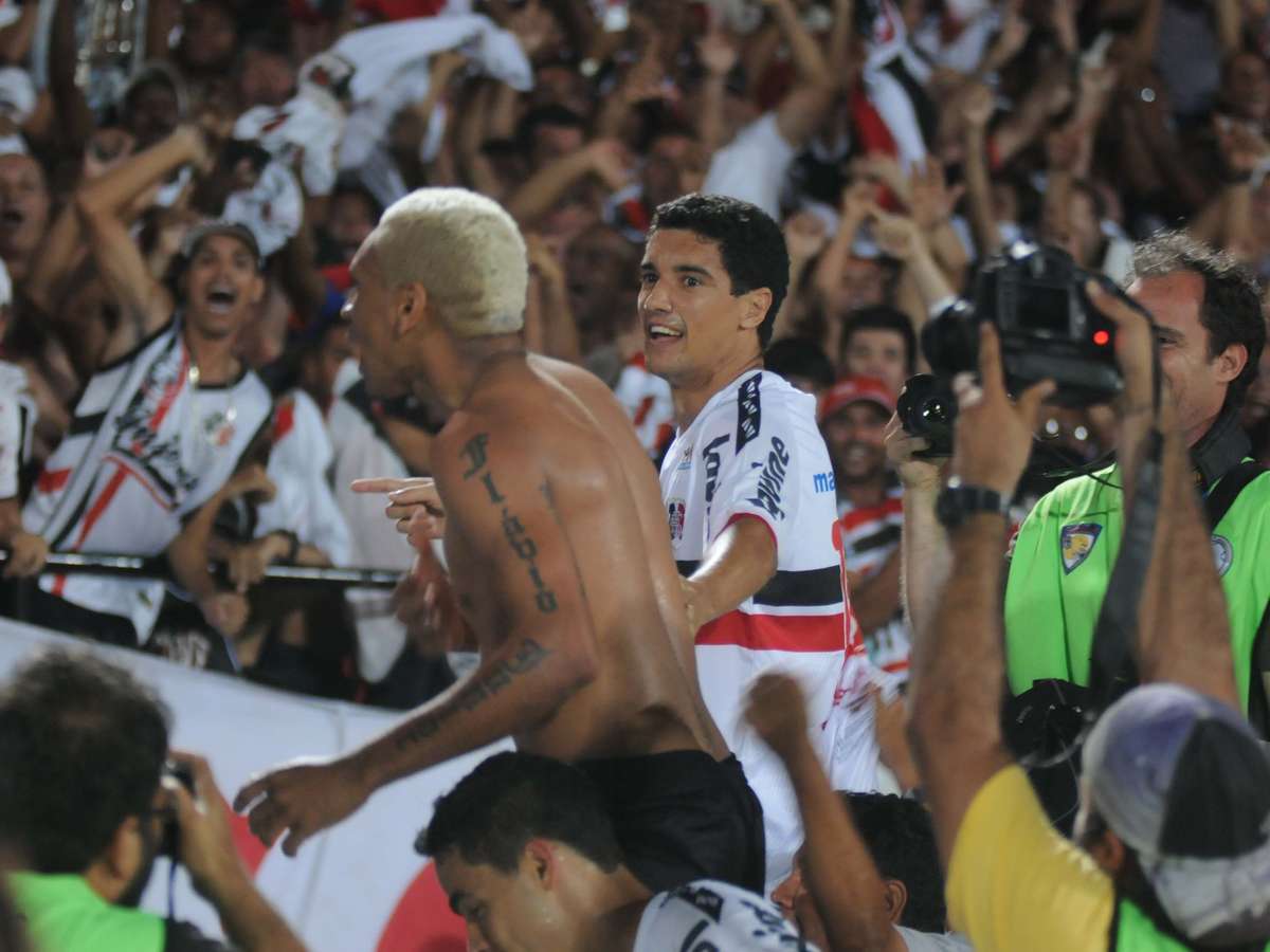 Flávio Caça-Rato comemora com a torcida do Santa Cruz após fazer o gol que garantiu a vitória sobre o Betim e a promoção à Série B; cerca de 60 mil compareceram ao Arruda