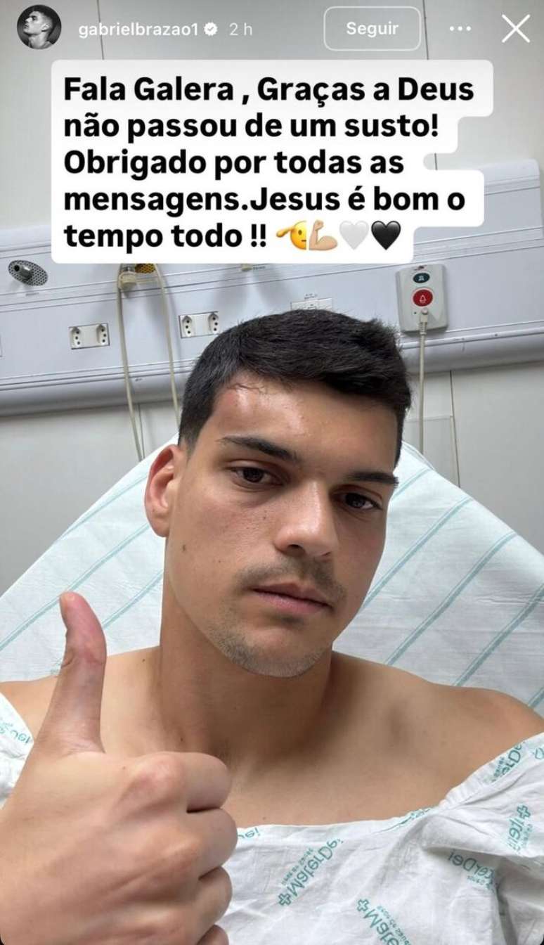 "Fala galera, graças a Deus não passou de um susto! Obrigado por todas as mensagens. Jesus é bom o tempo todo", postou o atleta acompanhado de uma foto sua no hospital para onde foi levado para ser submetido a exames.