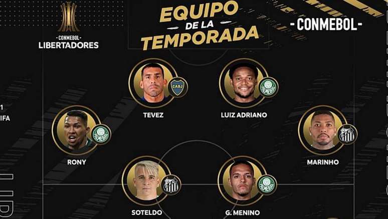 Assim, a seleção da Libertadores ficou composta com: Weverton (Palmeiras); Montiel (River Plate), Lucas Veríssimo (Santos), Gustavo Gómez (Palmeiras) e Matías Viña (Palmeiras); Gabriel Menino (Palmeiras), Soteldo (Santos), Marinho (Santos) e Rony (Palmeiras); Luiz Adriano (Palmeiras) e Tevez (Boca Juniors).