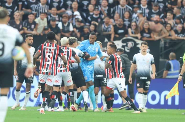 O desentendimento entre os rivais começou ainda durante o primeiro tempo da partida, na sequência do segundo gol tricolor. Durante a confusão, eles se empurraram e foram punidos com cartão amarelo pelo árbitro Ramon Abatti Abel.