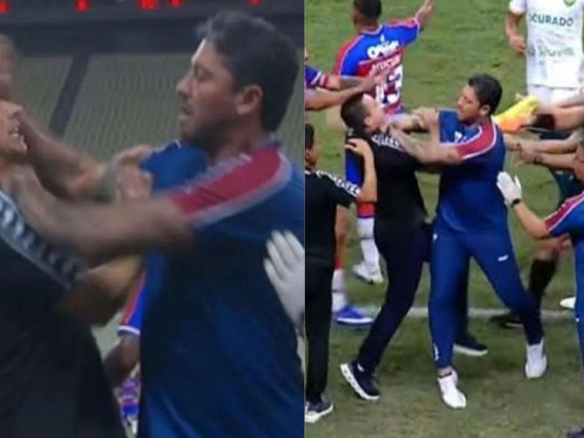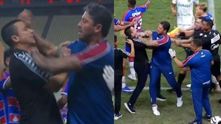 A confusão começou antes de o Leão do Pici cobrar um tiro de meta. Carpini estava discutindo e mandando um membro da comissão do Cuiabá sair de cena, quando Barros chegou com tudo empurrando o treinador do Fortaleza, que revidou.