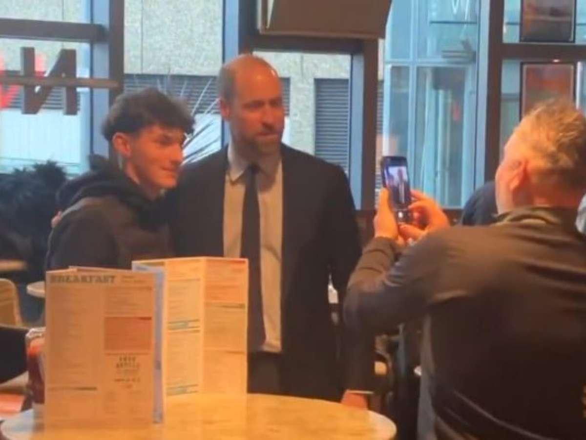 "O príncipe William parou para tomar uma cerveja e conversar sobre futebol com os fãs. Uma visita surpresa a um pub Wetherspoons, em Birmingham, depois de falar em uma conferência do College of Paramedics".