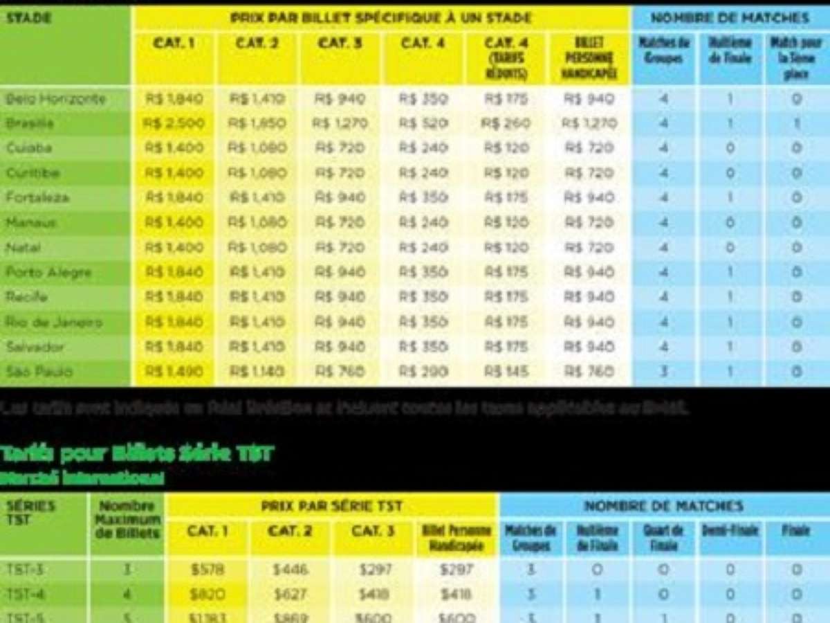 O valor mais barato seria na categoria 4, em quatro cidades: Cuiabá, Curitiba, Manaus e Natal, a R$ 120. Já o mais caro, R$ 2.500, para a categoria 1 em Brasília. A Fifa colocará os ingressos à venda em 20 de agosto.
