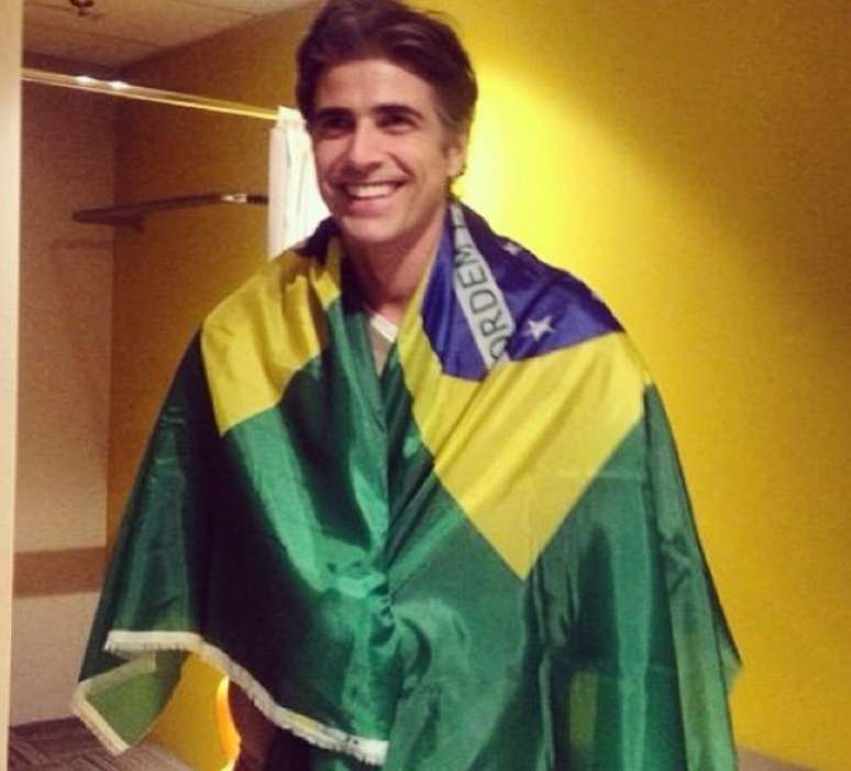 Reynaldo Gianecchini entrou na torcida pelo Brasil e se enrolou na bandeira
