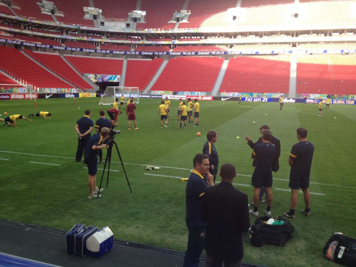 Classificada para a Copa do Mundo de 2014, a seleção australiana realizou nesta sexta-feira o treino de reconhecimento no Estádio Mané Garrincha, em Brasília. A equipe quer aproveitar o amistoso deste sábado contra o Brasil para conhecer melhor o palco do próximo Mundial e sair na frente de alguns rivais.