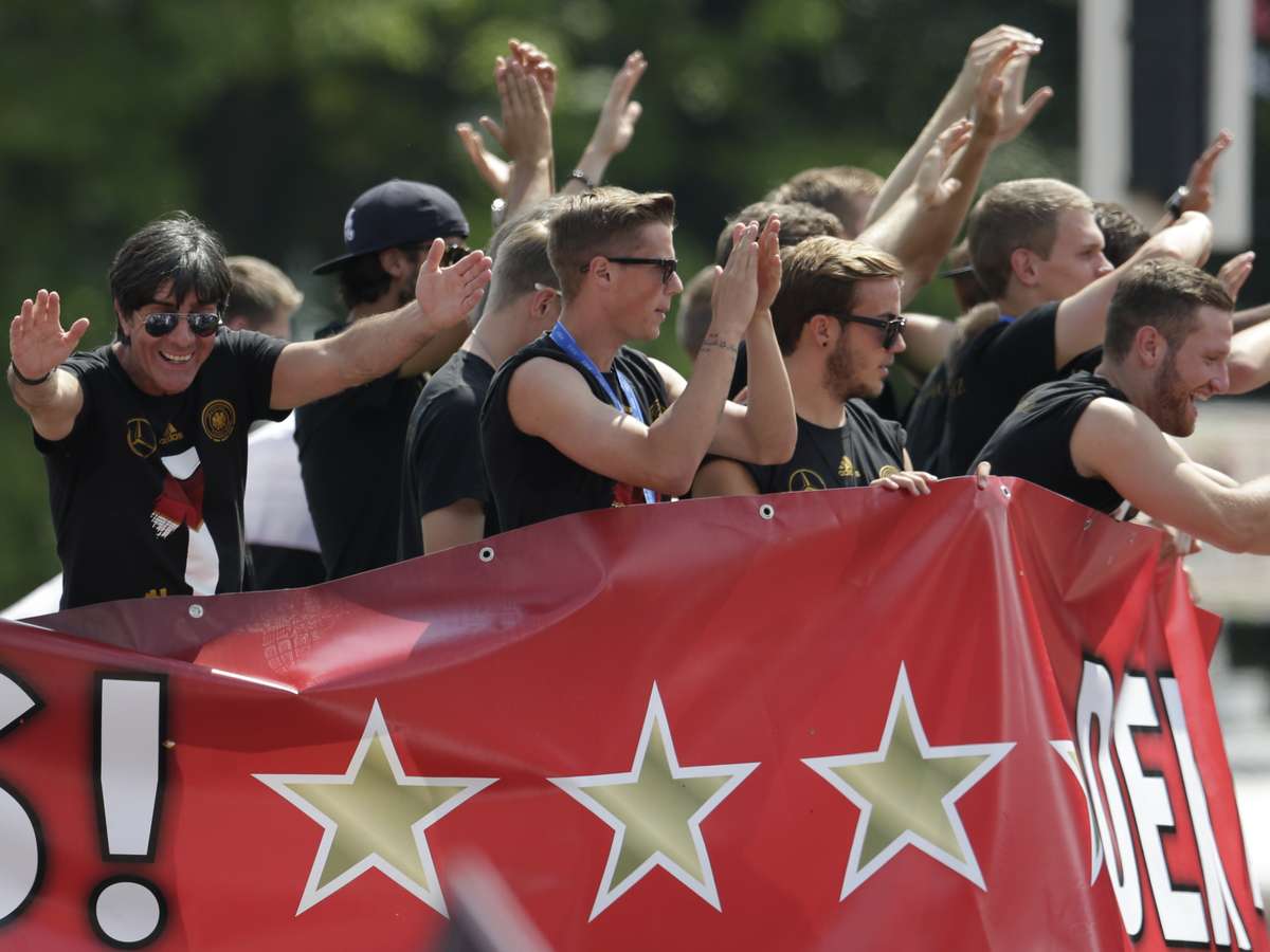 Após uma pausa para comer salsichões, Löw subiu ao palco de 30 metros montado em frente ao Portão de Brandemburgo ao lado dos jogadores, vestidos com camisetas personalizadas com um número 1 impresso no peito. "Isto é incrível", repetia o emocionado capitão, Philipp Lahm, enquanto dançava e festejava, mesmo cansado, com a taça do Mundial entre os braços.