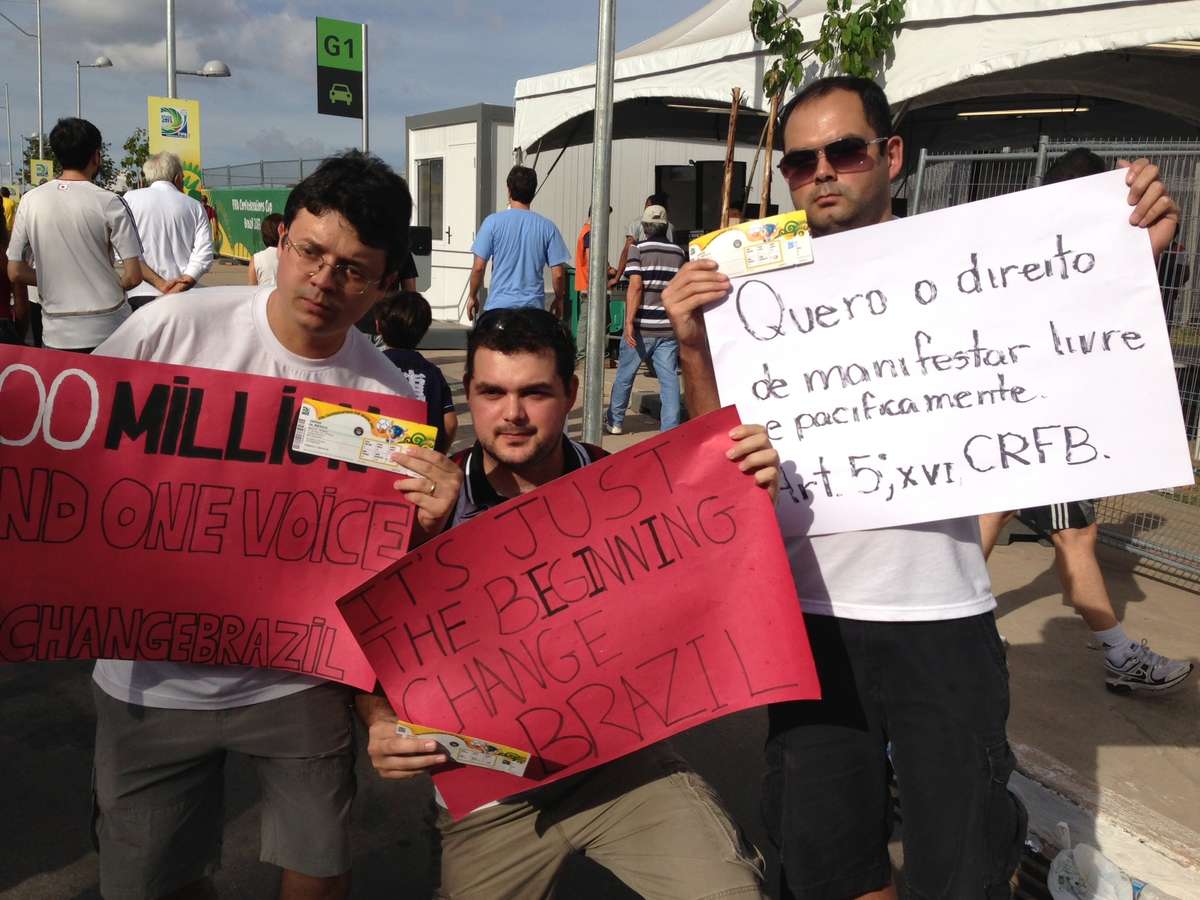 O professor de informática Geraldo Magela, o assistente jurídico Daniel Lino, o empresário Saulo Lino e o estudante João Marcos portavam cartolinas com dizeres a favor das manifestações que têm ocorrido no País nos últimos dias, mas foram privados de entrar no estádio.