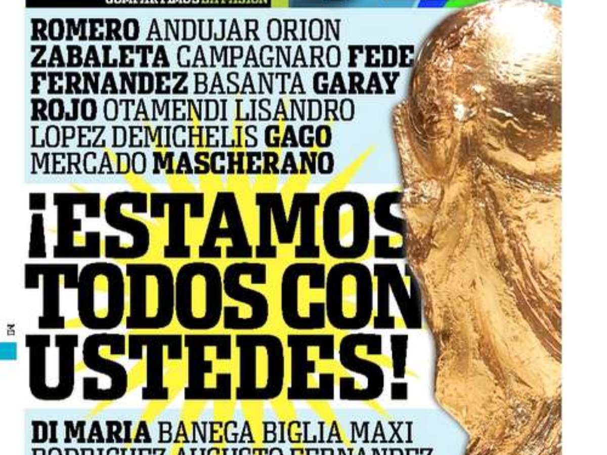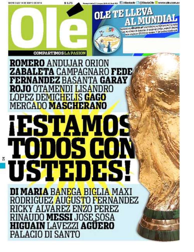 O jornal argentino Olé, famoso por acirrar a rivalidade com o Brasil, demonstrou nesta quarta-feira que está “abraçado” ao time que representará o país na Copa do Mundo de 2014. A publicação estampou em sua capa o nome dos jogadores convocados pelo técnico Alejandro Sabella ao lado da taça do Mundial e deu a manchete “estamos todos com vocês”.
