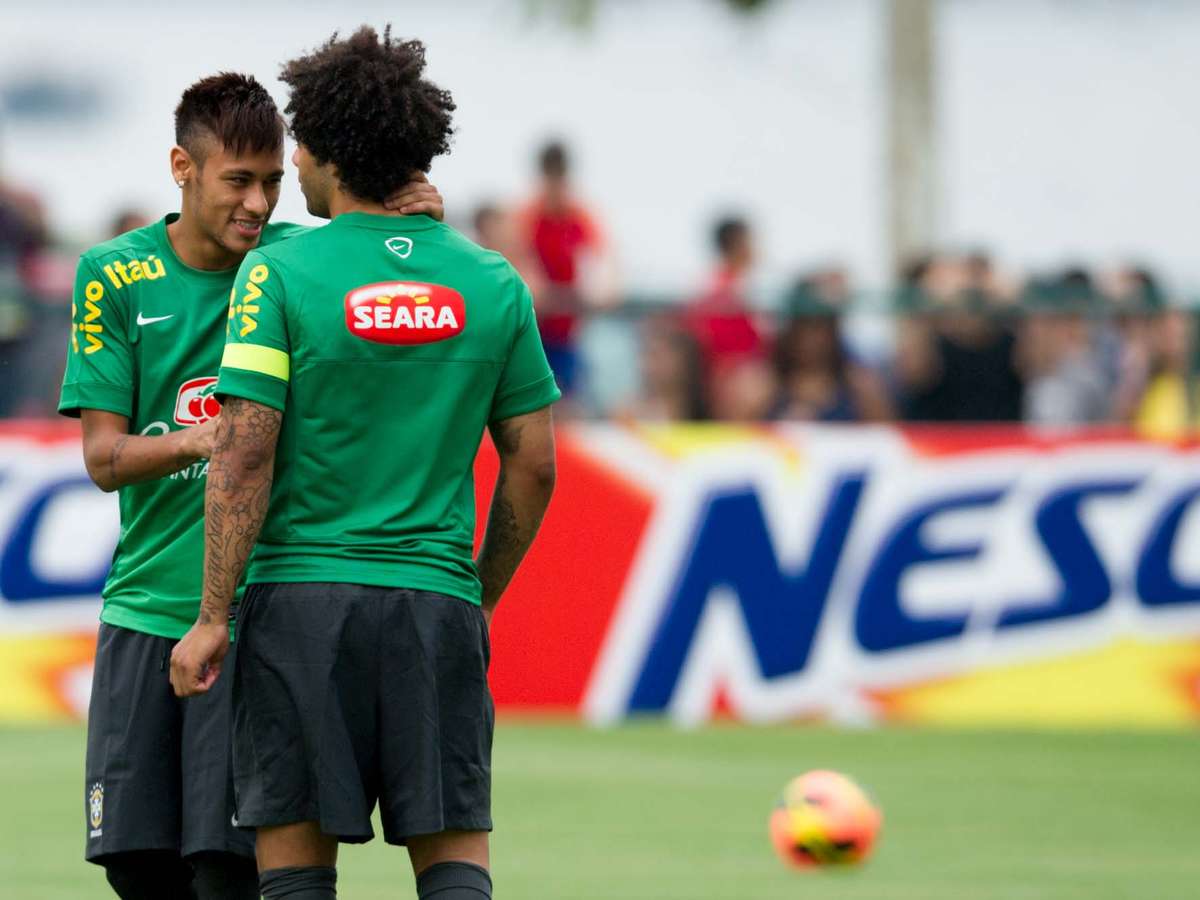 Futuros rivais no futebol espanhol, Neymar e Marcelo brincam em treino da Seleção