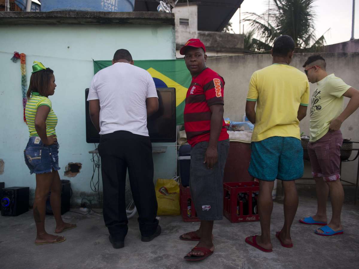 Em frente à tela, montada na direção contrária do estádio, se reunia parte da família dos dois, amigos e alguns vizinhos. Todos se revezavam distribuindo as lascas da carne e mantendo cheios os copos de cerveja. Ao lado, no viaduto, carros da Unidade de Polícia Pacificadora subiam e desciam enquanto garotos da comunidade soltavam pipas e vizinhos começavam churrascos em lajes vizinhas.