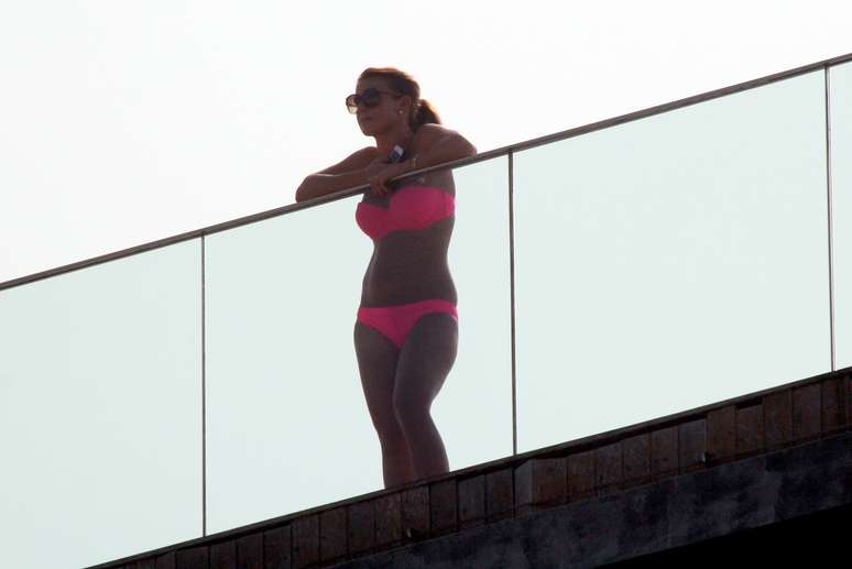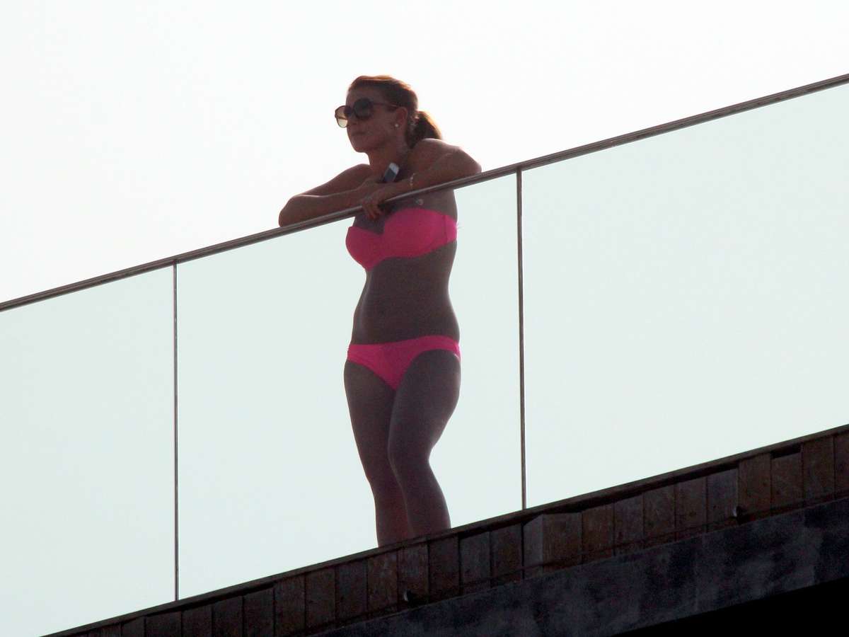 Coleen Rooney, mulher do atacante da seleção inglesa Wayne Rooney, apareceu de biquíni rosa na sacada do hotel Fasano, na praia de Ipanema, no Rio de Janeiro, onde está hospedada com a família durante a Copa do Mundo. A Inglaterra volta a campo nesta quinta-feira, contra o Uruguai