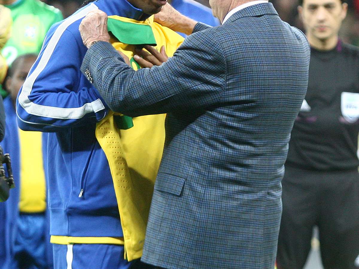 Ao pisar no gramado do Estádio Wembley para enfrentar a Inglaterra nesta quarta-feira, o meio-campista Ronaldinho entrou para o grupo de jogadores com 100 jogos pela Seleção Brasileira e recebeu homenagens pelo feito. Das mãos do presidente da CBF, José Maria Marin, o veterano ganhou uma camisa comemorativa e se emocionou.
