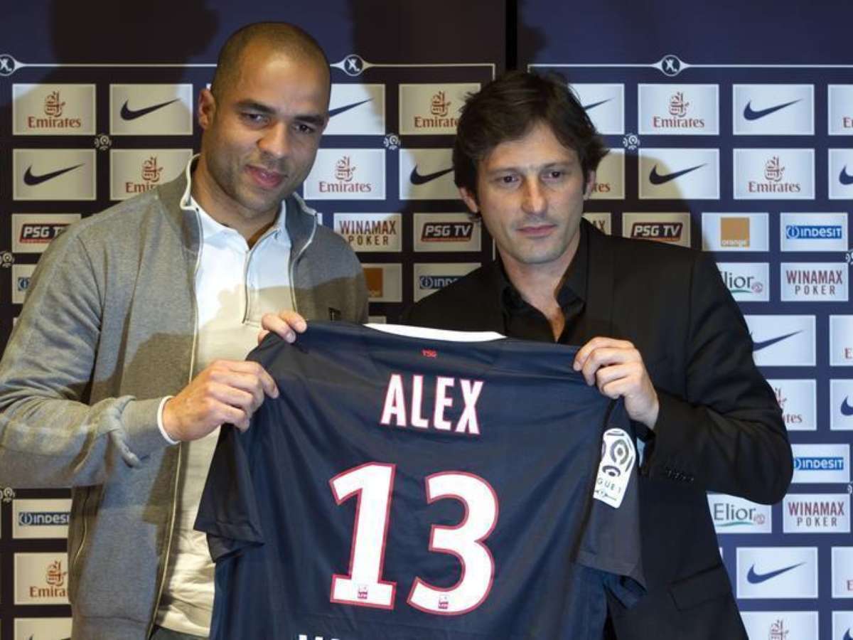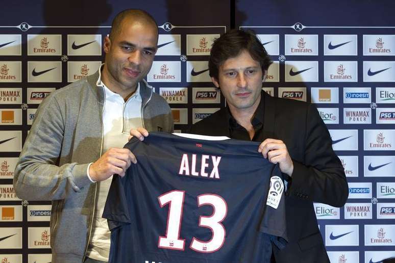 Foto de arquivo da apresentação do jogador Alex Rodrigo (E), ao Paris Saint Germain, em Paris. O atual campeão PSG não vai contar com o machucado zagueiro Alex na partida do próximo domingo, em casa, contra o Monaco, líder do Campeonato Francês. 27/01/2012