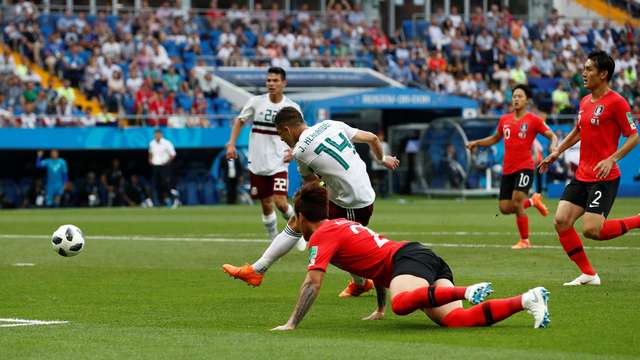 Chicarito Hernández recebe a bola de Lozano, corta o zagueiro, e enche o pé para ampliar a vantagem do México contra a Coreia do Sul. (Foto: Damir Sagolj/Reuters)