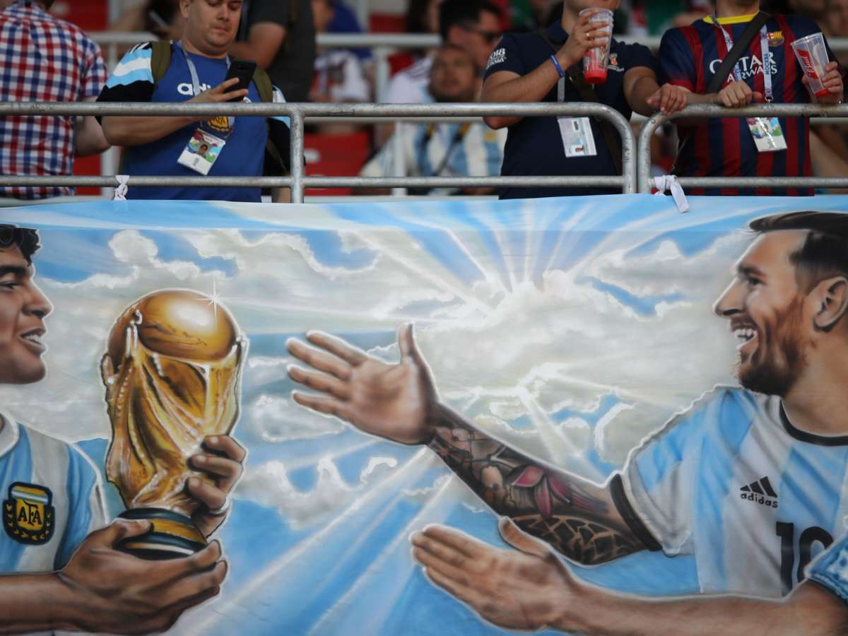 Arquibancada do Estádio Spartak, em Moscou, tem bandeira com imagem de Messi e Maradona