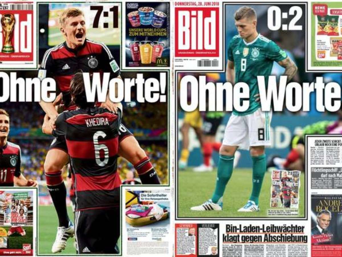 Há quatro anos, a exclamação "Sem palavras" aparecia sobre uma imagem de Toni Kroos comemorando com Sami Khedira. Desta vez, a frase surge sobre um Kroos cabisbaixo com a derrota alemã para a Coreia do Sul.