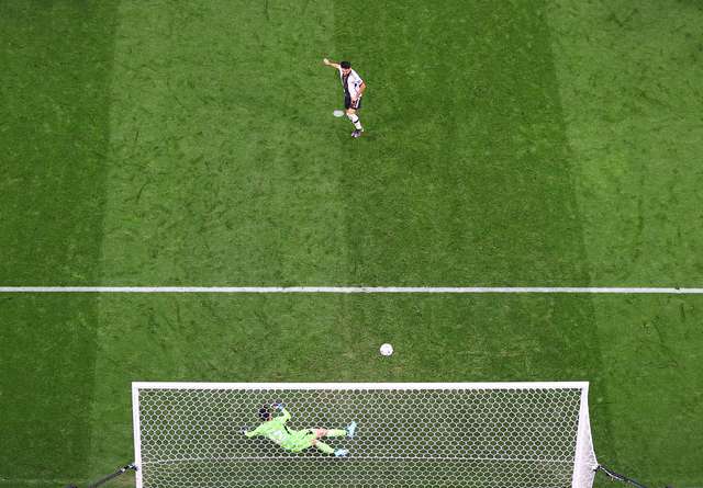 Finalização defendida junto ao lado inferior direito do gol. Serge Gnabry (Alemanha) finalização com o pé direito do lado direito da pequena área. (FOTO: Lee Smith/Reuters)