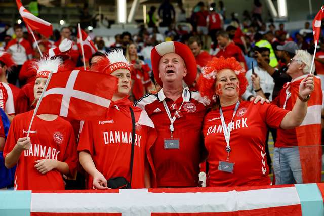 Fãs da Dinamarca com bandeiras e caraterizados, dentro do estádio na partida contra a Austrália. (Foto: Wolfgang Rattay/Reuters)